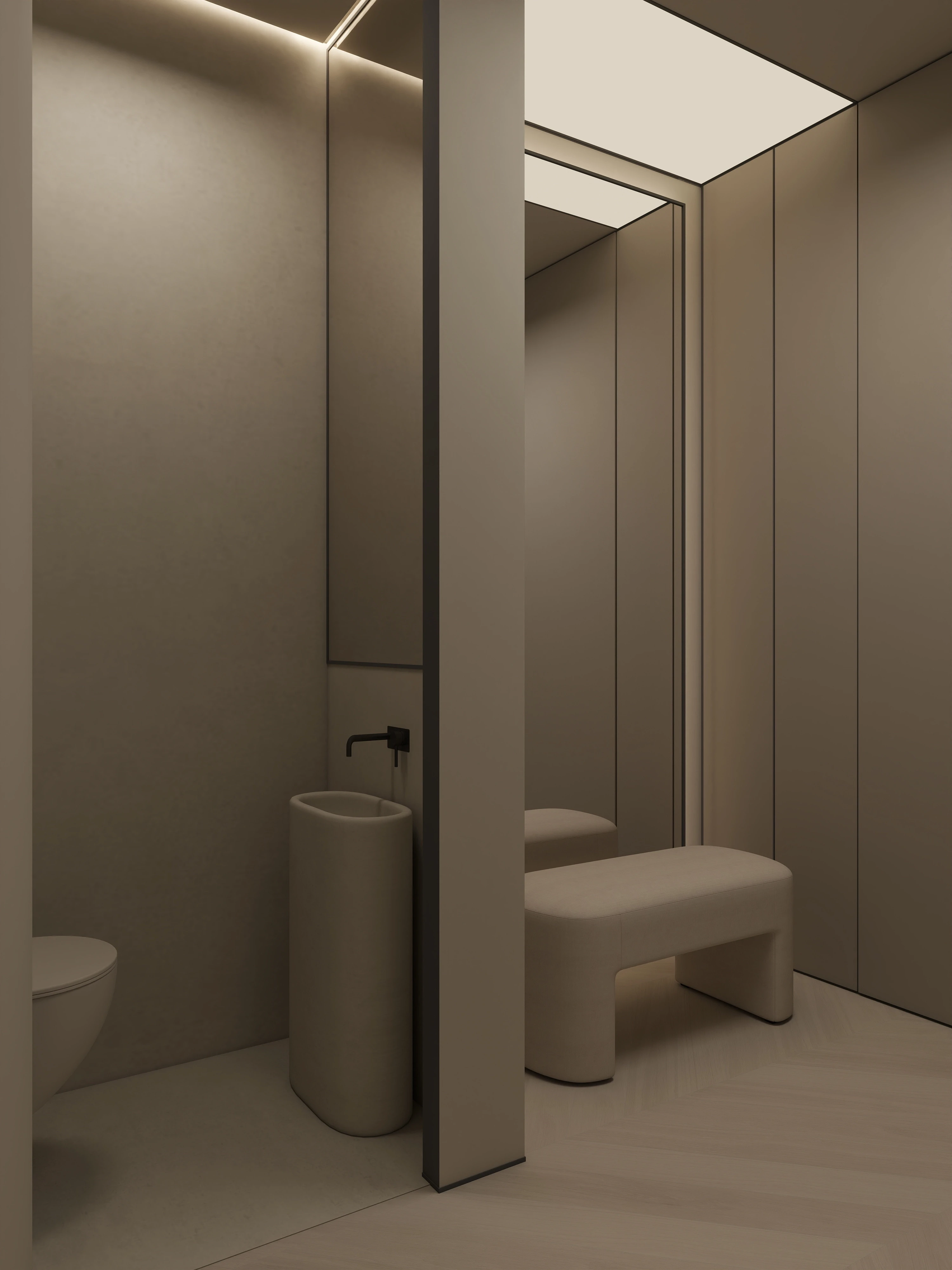 De entree verwelkomt met luxe wandpanelen, een subtiele ingang naar het toilet en een zitbankje voor schoenen, afgewerkt met ingebouwde plafondverlichting.